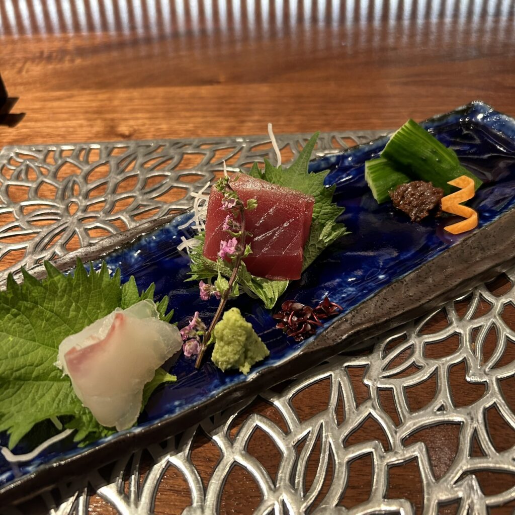 ●次はお造り!愛媛産の鯛とマグロでした!付け合わせにきゅうりと自家製の大葉味噌が添えてありました✌︎鯛とマグロは2切ずつで充分に味わうことが出来ます!コースの流れでここでお刺身いただけるの嬉しいなあ☺️