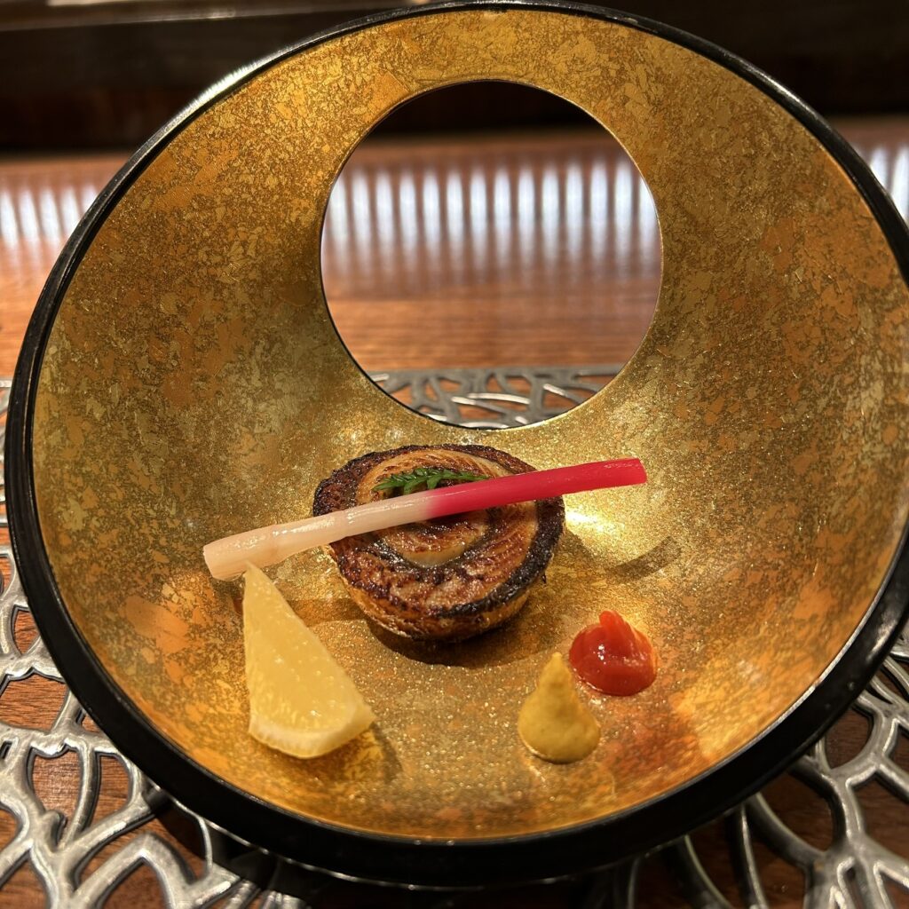 ●次は一口うな重と丸吸い!一口うな重の上には金箔がのっていました!一口でも鰻の香ばしさが伝わってきてもっと食べたい!!と思わせてくれる一品でした🙆‍♀️丸吸いは具としてすっぽんが入っているんですけど全くクセがなく食べやすかったです☺️ほっとする優しいお味でした!!