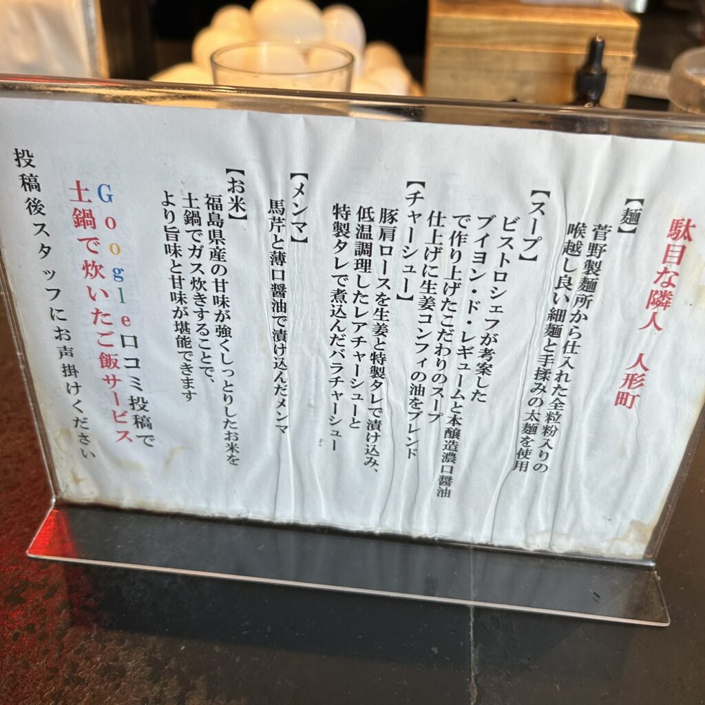 ●2021年2月にオープンした、駄目な隣人さん🤍食べログtop5000に選ばれている実力派店舗です🍜フレンチ出身のシェフが本醸造濃口醤油と野菜の出汁を丁寧に扱い、多種多様な卓上調味料でカスタム可能なラーメンを提供されております🙆♀️