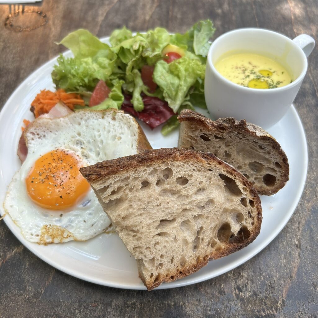 (カンパーニュ2p.サラダ.目玉焼き.ベーコン.スープ.ソーセージ)