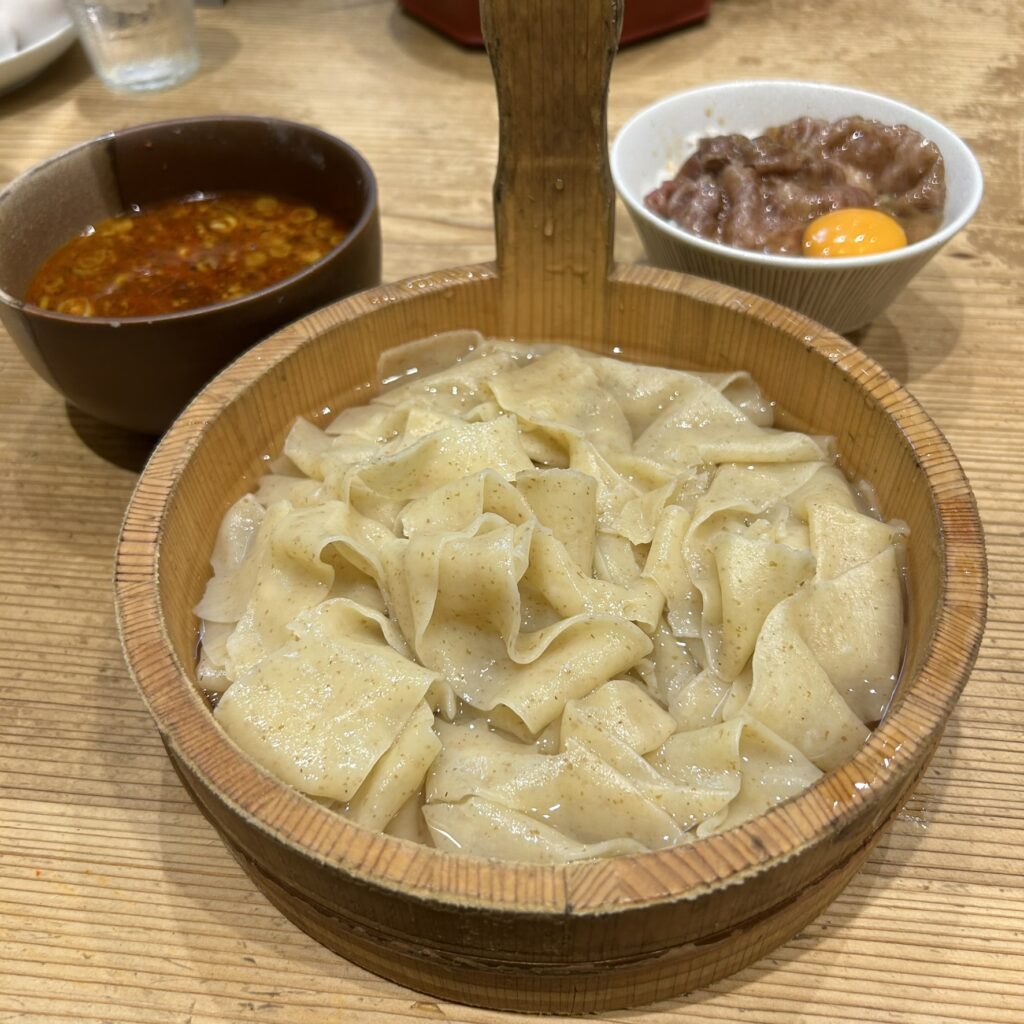 ●まずは平打ちざるそば!煮干し、坦々、冷製の3つのスープから選べます!今回は坦々スープをチョイス🙆♀️まずは何と言ってもこのインパクトある麺よ!!想像よりも太!!極太!!例えるなら、ひもかわうどんのような太さ!ラーメン屋さんでこの麺の太さはかなり新鮮です🫡で!この麺、喉越し抜群です。つるっとしているので見た目に反して食べやすいし口いっぱいに小麦の風味を感じることができて🙆♀️スープはアジア料理のようなスパイシーで八角がアクセントになっていました!八角が苦手な私でも美味しくいただくことが出来、逆に八角がないと物足りなささえも感じてしまうほどでした🤣細切りの唐辛子がしっかり入っているので辛さはきちんとあります!抜けは山椒の風味がふわっと香るのでさわやかに締めくくれます、最高です。夏バテで食欲なくても元気をもらえるような一品でした!
