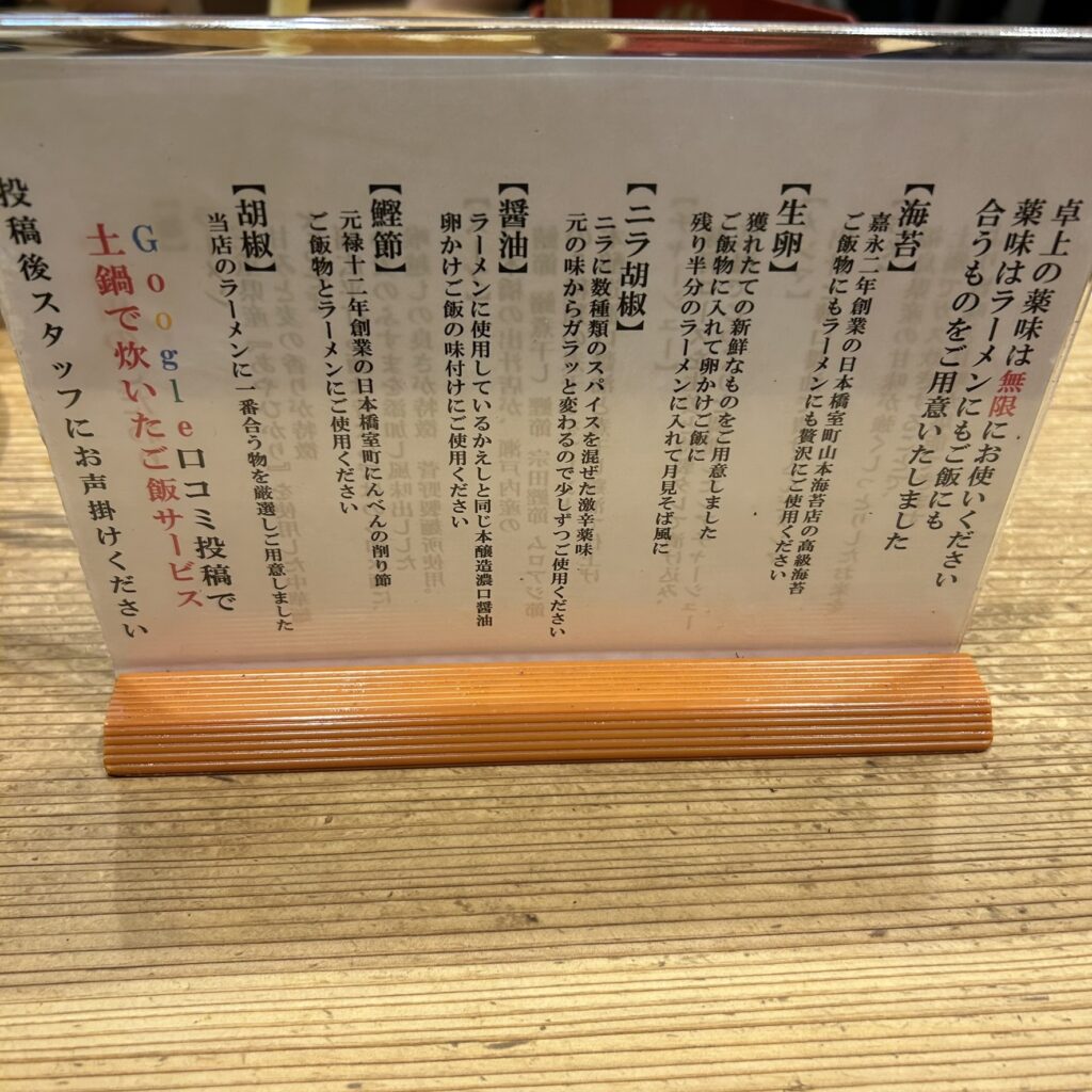 ●卓上には山本海苔店の高級海苔、生卵、ニラ胡椒、醤油、鰹節、胡椒があります!なんと!全て使い放題なので自分の好みに合わせて自分流の一杯を作ることも可能になります🫡🤍