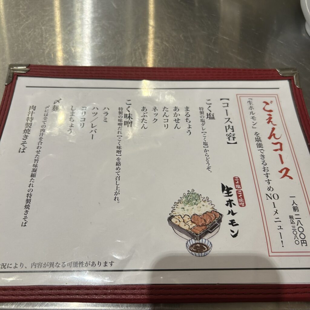 ●多種の生ホルモンをコスパよく堪能したい方は「ごえんコース」がオススメです!特製の塩ダレ「こく塩」から5種、特製の味噌ダレ「こく味噌」から4種、そして〆には焼きそばがついてきます😊