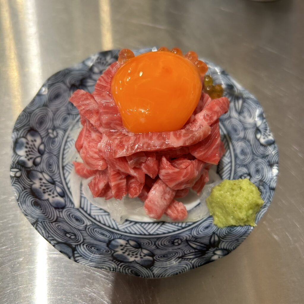 ●お通しが豪華すぎて初手から驚かされました…!お通しって唯一こちらから選択出来なくて何が来るか分からないワクワク感の中、豪華だと嬉しいしテンション爆上がりするよね☺️テンション爆上がりしたお通しは、和牛のユッケ!!いくらがたっぷり乗っていてビジュアル最高です🤍ユッケはコリっとした歯応えもありつつ新鮮さを感じました、おいしい!!卵のまろやかさといくらのアクセントが🙆♀️