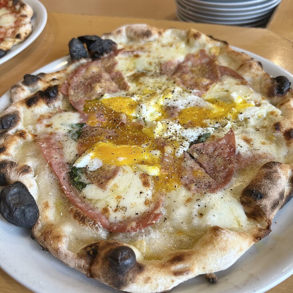 我ながら絶妙な選択…!こちらもめちゃくちゃ美味しい…!!!モルタデッラソーセージは薄切りにしたハムのような見た目なのですが、薄いのにめちゃくちゃジューシー!!!うまい!!!卵は半熟とろとろで焼き加減抜群。ピザ生地の端は焦げがあるのに卵はとろとろ、焼きが神業すぎない⁉️素晴らしいです。食べ応えもあってピザ3枚食べる予定がこちらの2枚目で満腹になってしまいました🤣また、ペッパーが効いていて酒のつまみになるピザなので酒飲みは特に必見です☑️