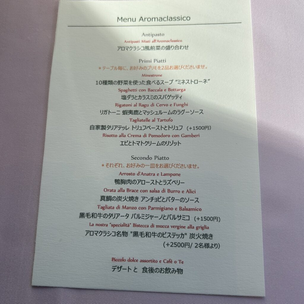 (前菜の盛り合わせ、プリモ2種、メイン、デザート、食後の飲み物)