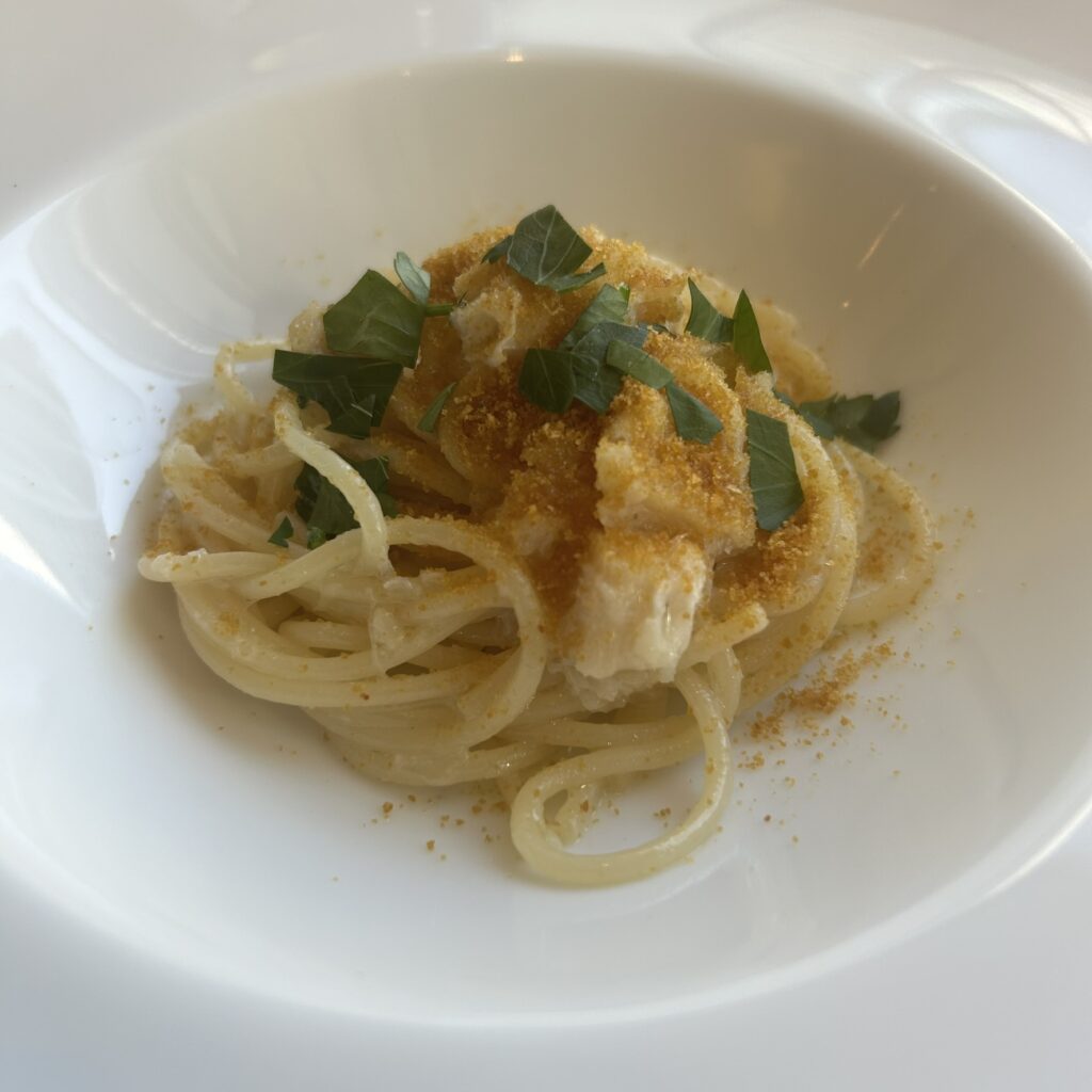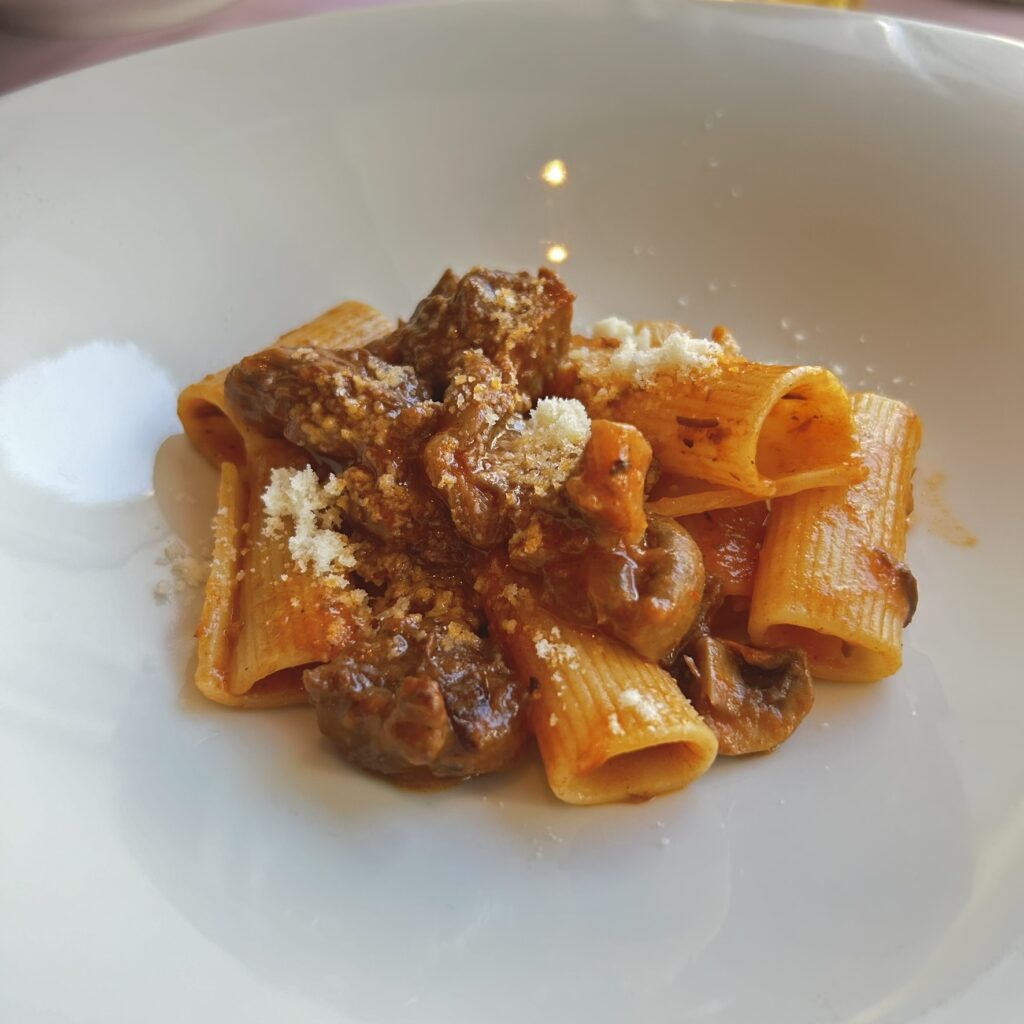 ●次は、5種の中からプリモを2種選択した「塩ダラとカラスミのスパゲッティ」「リガトーニ 蝦夷鹿とマッシュルームのラグーソース」!塩ダラのスパゲッティの方は、パスタ麺の茹で加減が最高☺︎塩味のバランスも良く美味しい!塩ダラはふわふわで食べていて幸せでした🤍リガトーニはラグーソースとよく絡み味わい深い一品でした!蝦夷鹿は臭みはなく良いアクセントになっていました☺️大満足のプリモ2種でした!